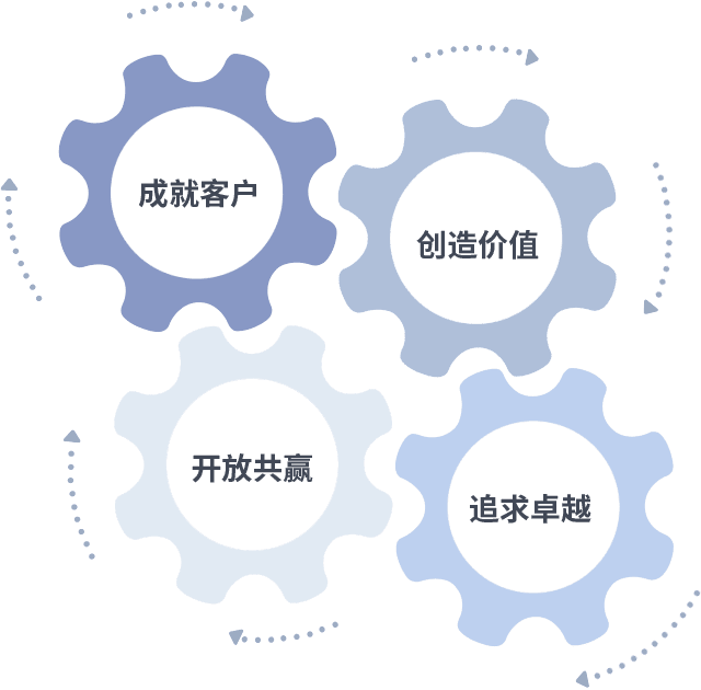 成就客户是一切决策的出发点,,创造价值是衡量所有工作的标准,,追求卓越是我们做事做人的态度,,,,开放共赢是我们的格局也是最终的结果。。。价值观的齿轮环环相扣,,推动着组织里的每个人不断向前。。。