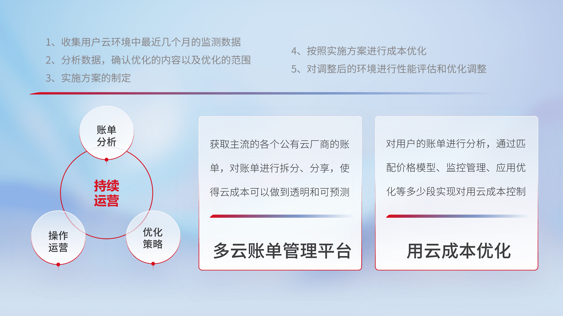 通过多云纳管,,,,以统一的资源数据模型把客户的云资源进行抽象和封装,,进而实现对多云资源的统一操作,,,,保障云资源管理的可靠性、、、、稳定性与可用性。。量身定制化运维内容,,,配置、、开发运维、、、、补丁管理、、、备份、、、、监控、、、、认证和访问管理、、、审计和日常巡检等,,保障在用云过程中的可靠度,,稳定度以及高可用率。。